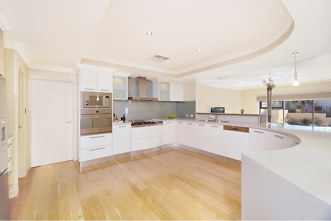 The cabinetry is finished in a high-gloss two-pack, while the hard timber floorboards are made from French oak. The elongated, stainless steel handles on the drawers and cupboards, coupled with the Caesarstone benchtop in ‘Nova Aurora’, enhance the kitchen’s functionality and add a contemporary appeal.