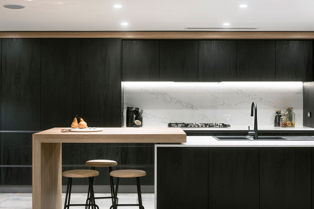Concrete-look porcelain tiles have been teamed with black cabinetry and marble benchtops in the main part of the house to create a flawless finish. Polytec ‘Ravine’ – a timber product that resembles limed oak – has also been used throughout.