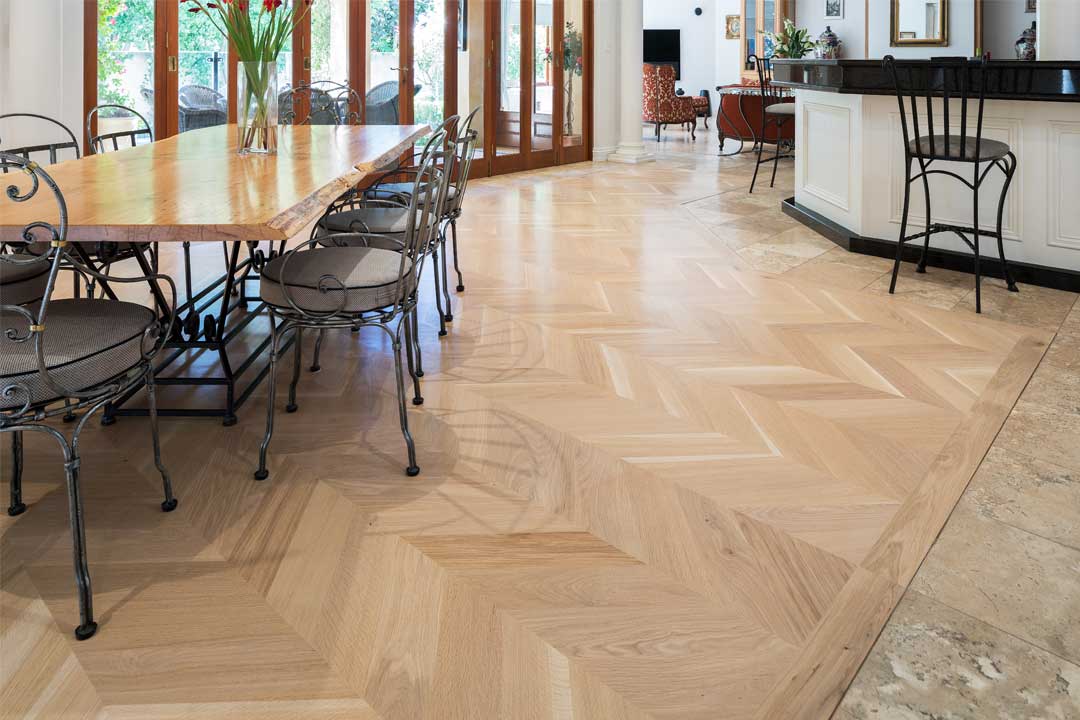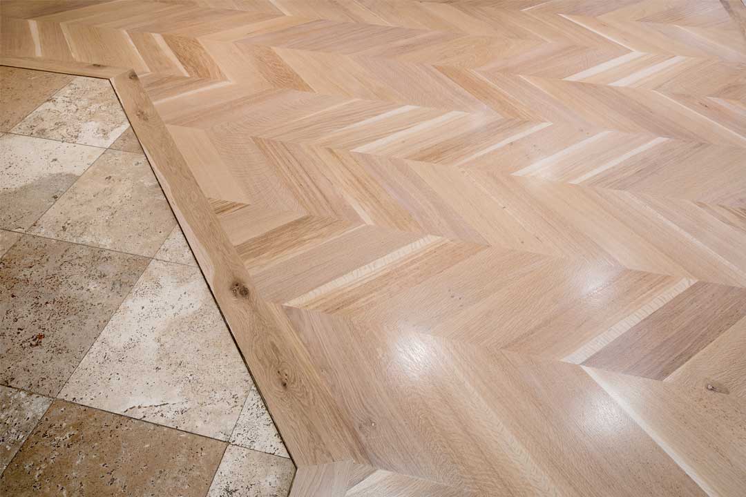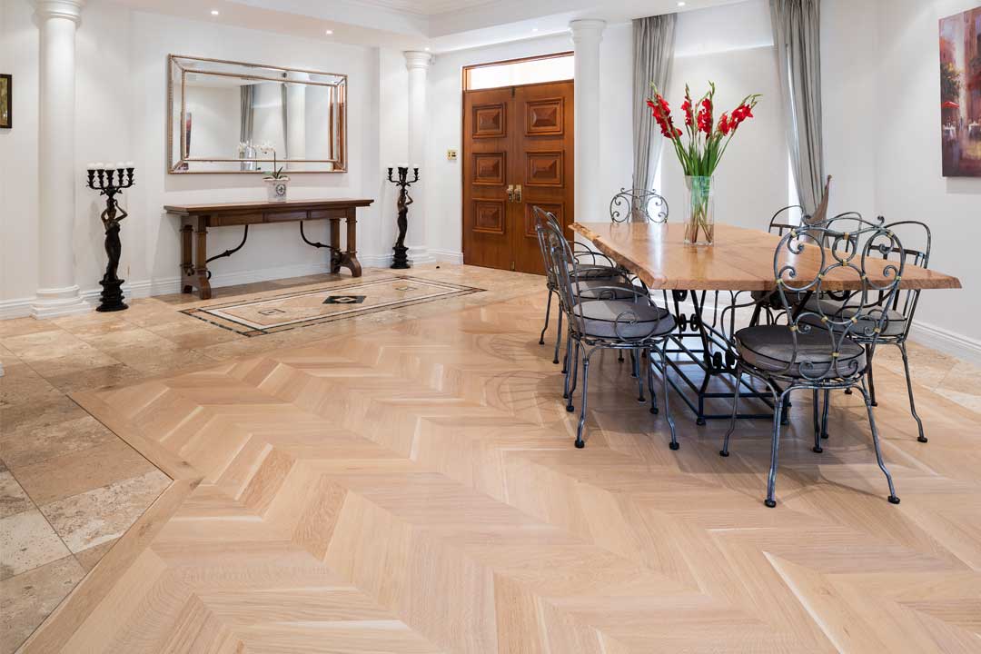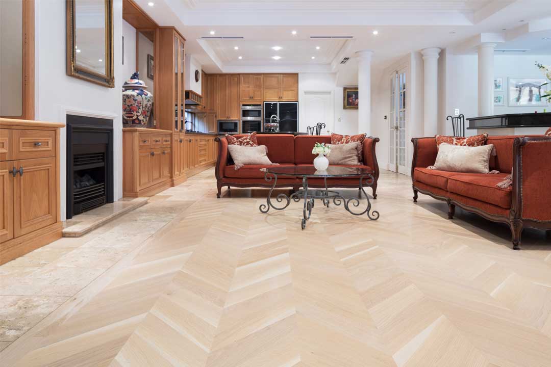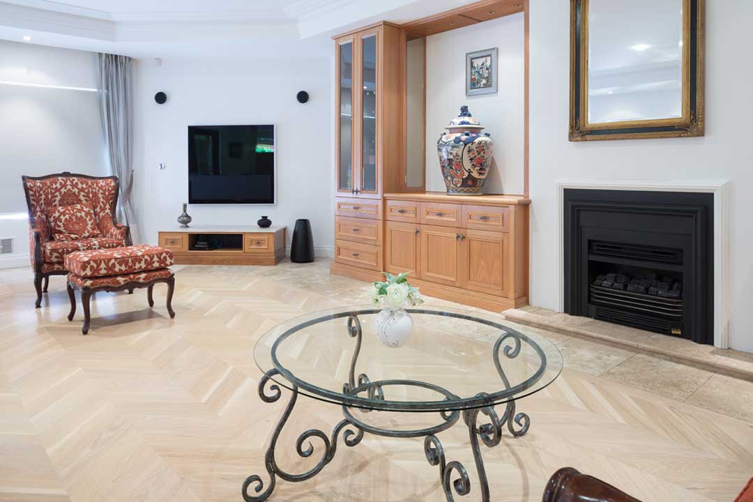 French oak chevron parquetry was selected after much discussion and consideration, and it achieved a wonderful result. A Bona White sealer was used to achieve a light and soft effect that highlights the timber’s natural colours and grain, which perfectly complement the existing décor and travertine tiles.