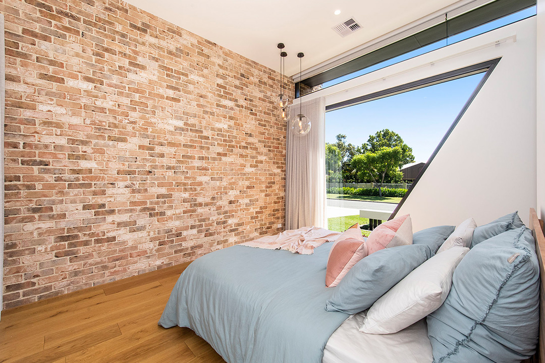 A feature wall of rumbled brickwork in the façade spills into the master bedroom, adding texture throughout the home and is contrasted by the modern design techniques that are implemented, such as sharp angles in the dark COLORBOND steel or stark white interiors. Together, the result is a stunning modern masterpiece that is both unique and liveable.