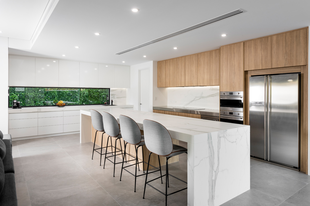 The lavish and well-appointed kitchen features a 4.6m x 1.2m island bench, dual extraction fans, a chilled- and boiling-water outlet and an induction cooktop, as well as a steam oven, conventional oven and a microwave oven. The adjacent scullery and food-storage area caters for the clients’ passion for gourmet cooking. The expansive parents’ wing comes with ‘his and hers’ home offices and walk-in wardrobes, as well as a large en suite and separate toilet. This section of the home is separated by a large pivot door, which allows the children to use the front of the home for study or recreation with friends. The large enclosed backyard is set slightly below the alfresco area, and provides the ideal spot for the children to play with the family dog.