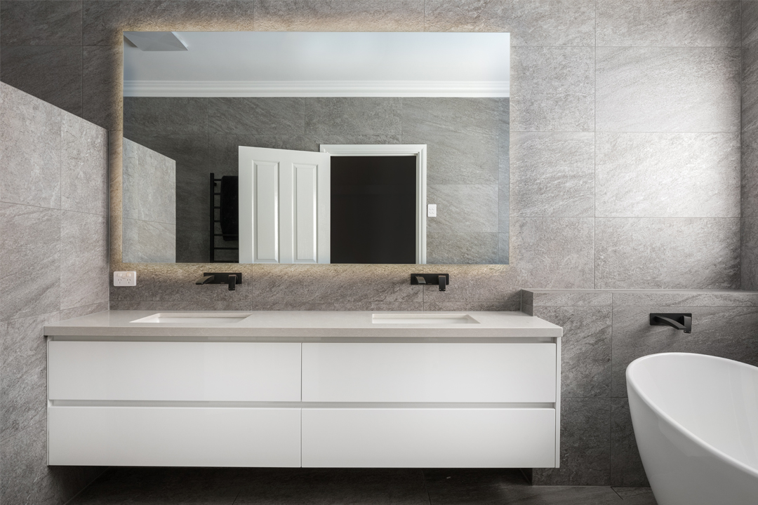 With its sleek minimalist look and key statement features, this kitchen is the central entertaining hub of the home. Catering to the clients’ love for natural materials, Kre8 Constructions WA revamped the existing jarrah floors and added a marble finish to the splashback and island bench. The space is now modern and sleek, with visual depth, alluring texture and an inviting warmth.