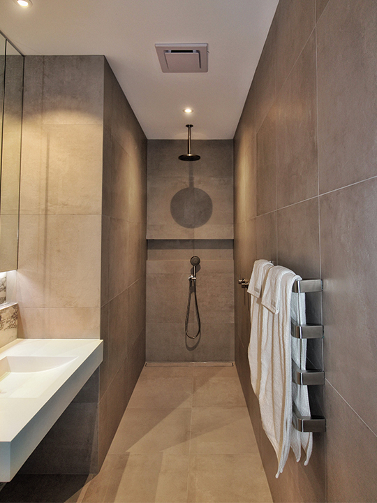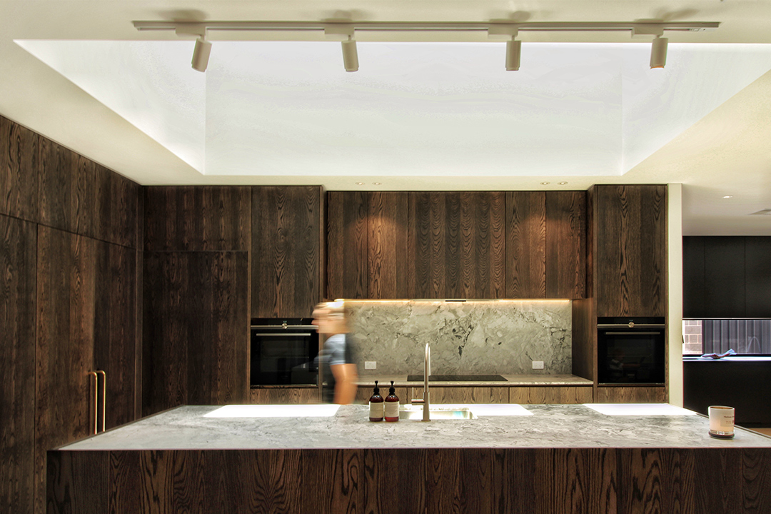 Natural light illuminates the impressive kitchen through the generous Velux skylight, drawing attention to the kitchen’s classy features including the dark timber cabinetry, mesmerising marble splashback and discreet built-in appliances. The doorframes, cornices and skirting boards are all accentuated with a shadow line, a subtle element that elevates the overall design.