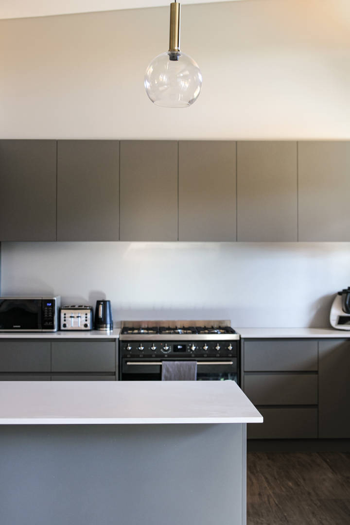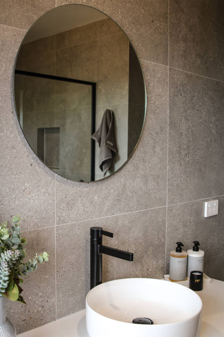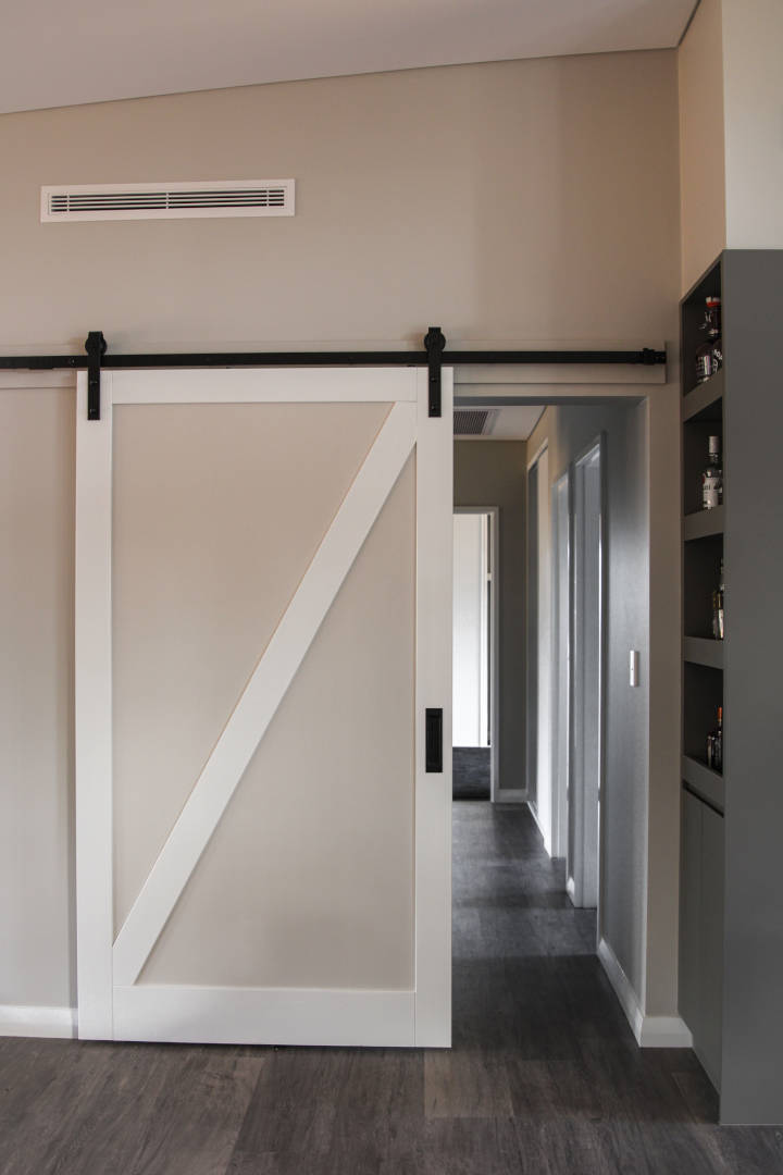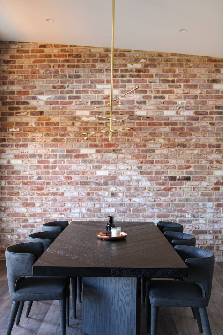 The interior is sleek and sophisticated, which perfectly accommodates the client’s modern taste. The kitchen includes white marble countertops and grey cabinetry, which ties in with the dark timber floorboards. The area keeps a touch of ruralism through the addition of a barn door that blends seamlessly with the wall colouring. Flowing on from the kitchen, the dining area features an eye-catching, rustic brick wall, which uses bricks that were salvaged from a 100-year-old building that Stallion Homes had demolished previously. The gold light fitting hanging over the table is complemented by the brick and adds a modern flair to the space.