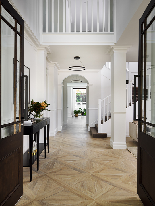 Upon entering, instant calm and space is achieved through the classic parquetry timber-like tile flooring and the void spaces above, created by the grand second storey. An impressive master suite awaits just off the front entryway, featuring a walk-in robe with built-in storage, and a luxurious bathroom replete with a freestanding bathtub and double vanities.
