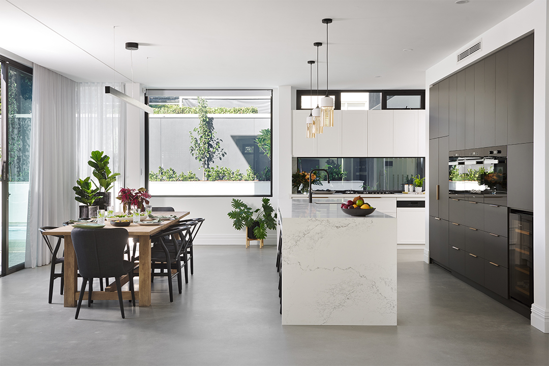 At the rear of the house is the open-plan living area that sits on smooth, polished concrete flooring. A statement fireplace in the living room section ties in the traditional aesthetic, while the stunning marble island bench, matte-black cabinetry and feature pendant lights bring the home into the modern age. Around the corner, a conveniently placed scullery provides additional space for food preparation and cleaning up, allowing the main kitchen to remain neat and tidy no matter the occasion.