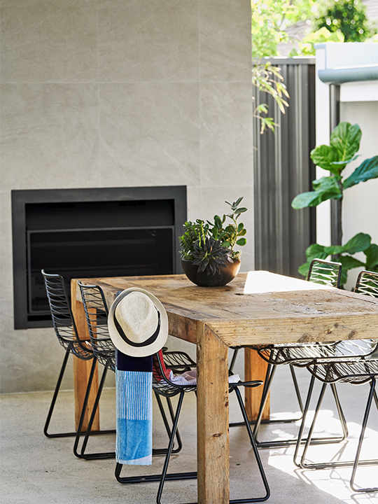 Bi-fold doors open up the living area, seamlessly connecting it to the airy alfresco. Here, the residents can utilise the state-of-the-art outdoor kitchen and cosy up by the built-in fireplace.