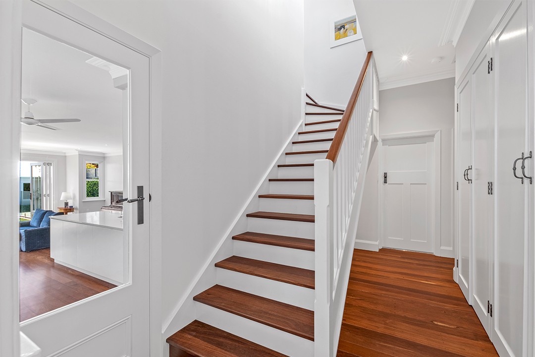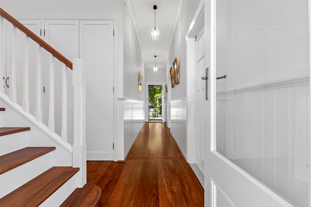 The charming entryway and beautiful staircase continue this expression of the heritage style. Rich jarrah flooring contrasts gently with the soft white walls, while the transparent door, dado panelling and feature pendant lights draw the eye, making the entryway warm and inviting.