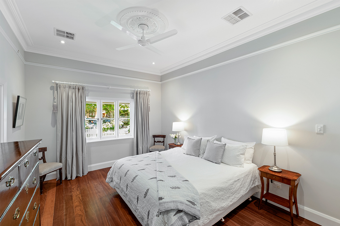 Modern and traditional designs combine within the home. Highlighting the more traditional side are the authentic profile skirting, architraves and hanging rails in the master bedroom, which give it an elegant, old-world feel.