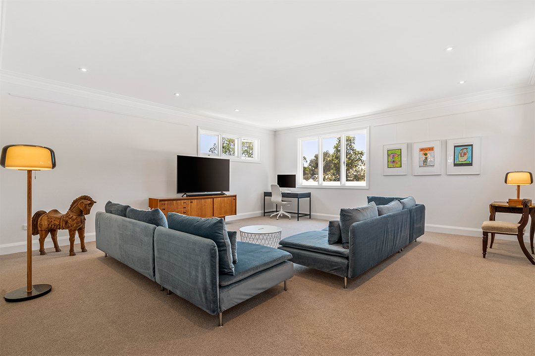 The spacious open-plan family room boasts a more contemporary aesthetic, particularly the kitchen, which showcases clean-cut stone benches, an industrial-sized oven and simple yet stylish rangehood. A sizeable dining and lounge area accommodate the rest of the space, allowing for holistic family time.